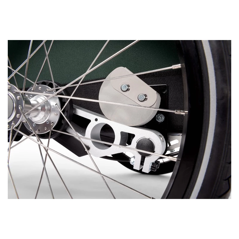 Elle est équipée d’un arceau de sécurité pour les enfants, d’un frein de remorque, de roues à rayons avec chambre à air et d’une suspension à élastomer pour une conduite stable et confortable.